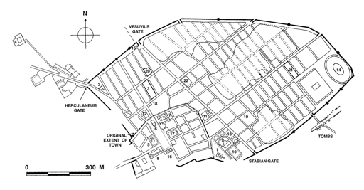 Figure 6.1 Pompeii, general plan. 1, Triangular Forum; 2, House of the Surgeon; 3, House of the Faun; 4, Villa of the Mysteries; 5, Temple of Apollo; 6, Temple of Jupiter; 7, Macellum (meat and fish market); 8, Basilica; 9, Large theatre; 10, quadriporticus; 11, Stabian Baths; 12, Forum Baths; 13, Small theatre; 14, Amphitheatre; 15, Castellum Aquae; 16, Civic Offices; 17, Building of Eumachia; 18, Temple of Fortuna Augusta; 19, House of the Menander; 20, House of the Vettii; 21, House of Octavius Quartio; 22, Central Baths.