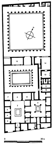 Figure 6.5 Pompeii, House of the Faun, second century bc: plan. 1, fauces (entrance passage); 2, Tuscan atrium; 3–5, cubicula; 6, tablinum; 7–8; triclinia; 9, Tetrastyle atrium; 10, animal stall; 11, latrine; 12, bath; 13, kitchen; 14, triclinium; 15, exedra with the Alexander mosaic; 16–17, gardener’s rooms.