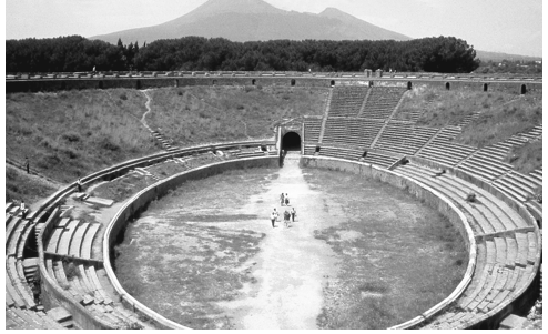followed and a military colony, called Colonia Cornelia Veneria Pompeianorum, was established in 80 bc. Roman weights and measures were adopted, Latin became the official language and changes were made to the forum. It was paved with limestone and statues began to be erected in honour of worthy citizens in the same way as they were in Rome. Many new buildings were put up to appeal to the new colonists, such as the amphitheatre, the Small Theatre, the Forum Baths and the Temple of Venus. The amphitheatre (Figure 6.9), measuring 135 × 103 metres, was built before 70 bc and is therefore the oldest permanent amphitheatre in the Roman world. The word ‘amphitheatre’ derives from the word ‘theatre’, but the ‘amphi’ part refers to the fact that the seats run all around a central arena, where gladiatorial games and animal hunts (venationes) took place (Figure 6.9). Built in the SE corner of the