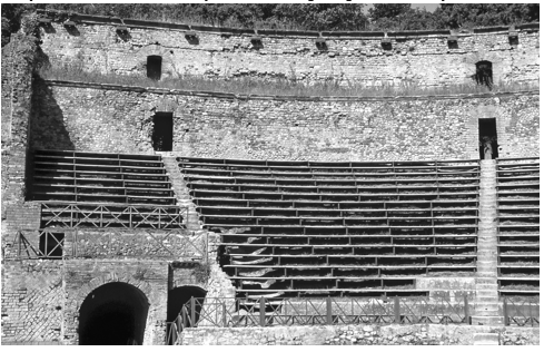 Figure 6.11 Pompeii, Large theatre looking SW. At bottom left is the tribunal, and higher up is the wall dividing the summa cavea from the media cavea. The wall behind is the outer wall of the theatre with the corbels for the vela masts near the top.