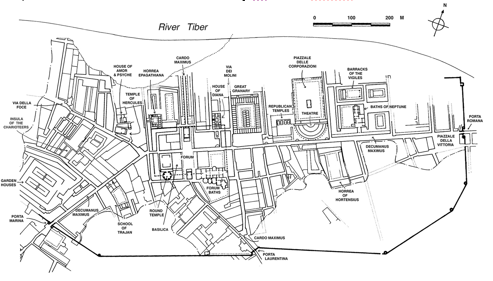 Ostia is situated on the banks of the Tiber near its mouth, about 25 kilometres from Rome (Figure 1.3). It began as a castrum (fort) designed to protect the coast against raiders from Etruria and Greece. Marauding bands of Gauls were still active in the area after the great invasion of 390 bc, and in 349 bc Greek fleets had ravaged the coast from Antium (Anzio) to the Tiber estuary. Colonies composed of Roman citizens were established at Antium (338 bc), Tarracina Anxur (329 bc) and Minturnae (296 bc). Ostia was probably the oldest of these forts, although according to ancient authors a settlement was established there as early as the seventh century bc. The castrum, dating perhaps to the period 349–348 bc or 338 bc, was a rectangle measuring 194 × 125.7 metres, and although the actual tufa walls have largely disappeared its outline is still visible around the forum area (Figure 6.15). Because Ostia was built around the old castrum and several streets followed the alignment of old roads the decumanus and the cardo were not nearly as regular as in a fully planned city. The eastern branch of the decumanus was quite straight and terminated at the Porta Romana, while the southern cardo, western decumanus and Via della Foce transmitted their irregularity to the surrounding districts. The northern part of the city is notably orderly in its planning because it fronted the river and was under the control of the city Praetor.