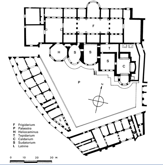 The Stabian Baths took their present form during the second century bc, although a bathing establishment had existed on the site since the fourth century bc (Figure 2.6). Recent excavations have shown that the trapezoidal shape of the palaestra dates back to the fourth century bc, as do the row of small hip baths to the north of the palaestra. In the second century bc a complex of bathing rooms was added to the east side of the palaestra (Figure 6.3).