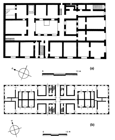 Lighting was a problem which was solved by inserting large windows facing the street, often supplemented with further windows looking onto an inner courtyard (Figure 6.21a). Sometimes the windows had shutters and even if they were glazed it was mainly with selinite which cut down the amount of light entering the room. The rooms and apartments were separate but some facilities were shared, such as the cooking and eating area (medianum).