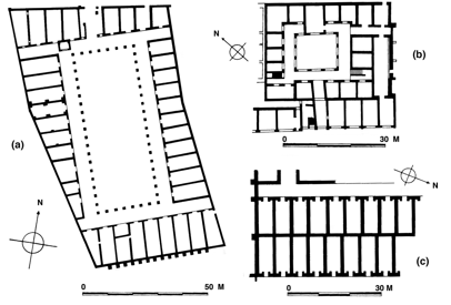 Figure 6.22 (a) Ostia, Horrea of Hortensius, granary, c. ad 30–40: plan; (b) Horrea Epagathiana, warehouse, c. ad 145–50: plan; (c) Ostia, Antonine Horrea: plan.